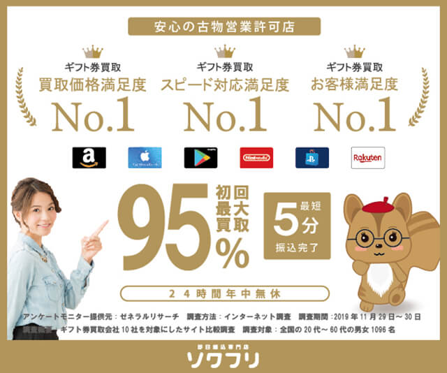当サイトでも一位を獲得しているギフト券買取会社(ソクフリ)が、超大手の市場調査会社(ゼネラルリサーチ)でも三冠達成と、同じ結果になりました。この実績を見ると、素晴らしいギフト券買取の会社ということがわかります。当サイトでも一番おすすめできるギフト券買取店舗は【即日振込専門店のソクフリ】です。
